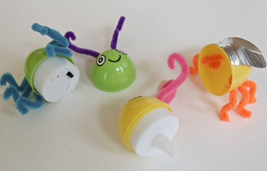These fireflies are super easy to make. Just pop a flameless LED tealight into a plastic Easter egg. You don’t even need glue! Poke holes through the egg with a thumbtack to insert the pipe cleaners. The eyes are drawn onto white sticky labels, and the wings are silver duct tape. Quick, easy, and totally cute!